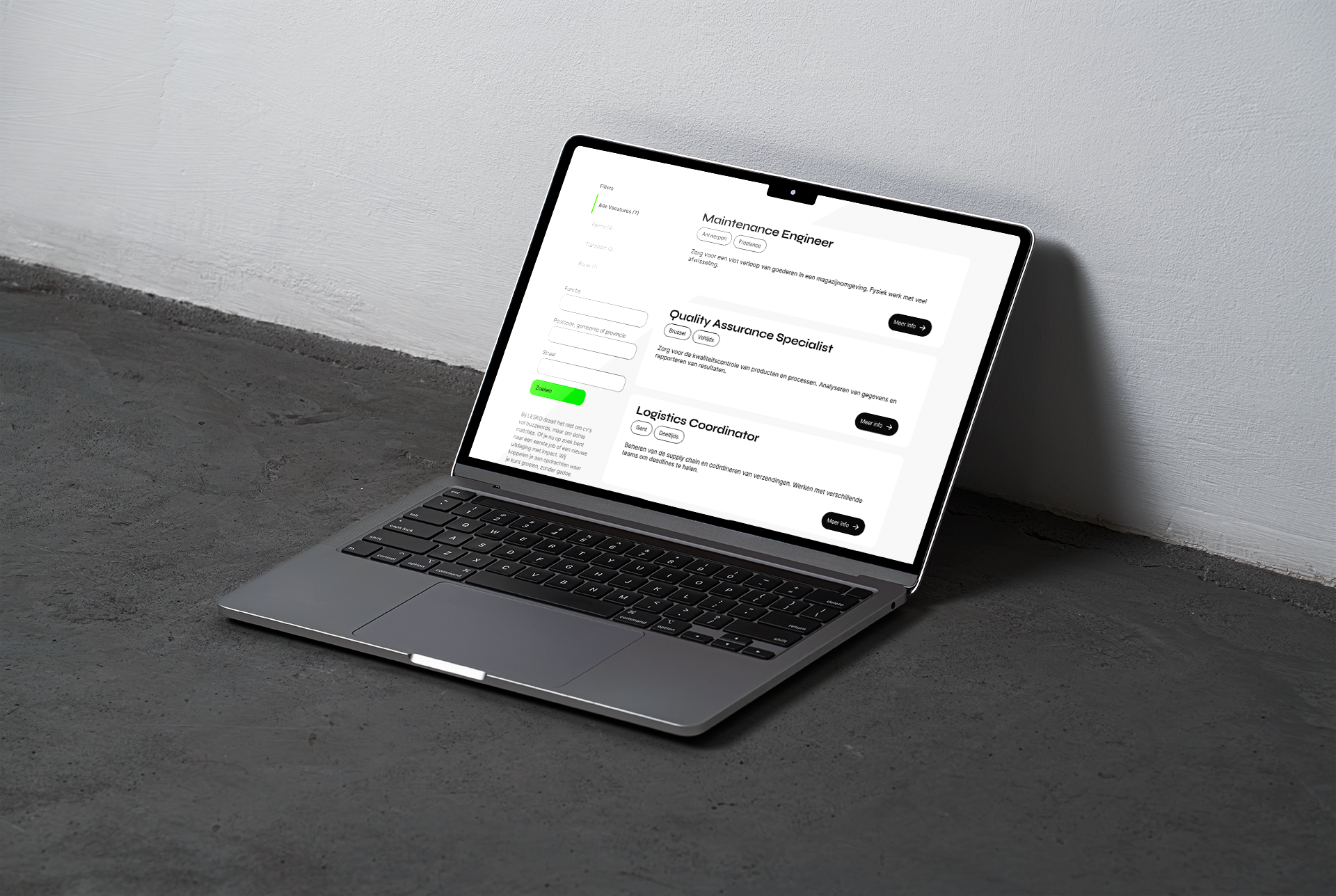 Voor Lesko ontwikkelde ik als freelance designer de visuele en structurele basis van hun eerste website. De focus lag op duidelijkheid, een uitgesproken stijl en een performante vacature-ervaring.